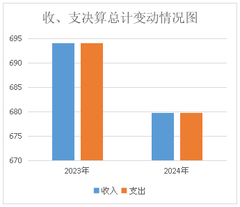 2024年度收、支总计均为679.73万元。与2023年度相比,收、支总计各减少14.34万元,下降2.07%。主要变动原因是2023年办公大楼维修已基本完成,2024年仅支付办公大楼尾款,项目经费减少。